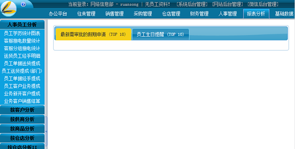 包括人事档案、规章制度、问卷调查、考勤管理四个功能模块。此模块提供了综合的人事管理、全面行政事务的在线管理。